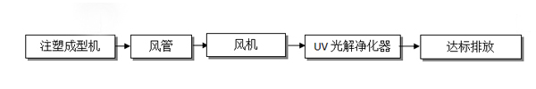 該公司在生產過程中有注塑成型工序,該工序產生了一定量非甲烷總烴有機廢氣。根據廠房提供的資料,我們工程師在參考了廣東省地方標準《大氣污染物排放標準》(DB44/27-2001),中華人民共和國《大氣污染物綜合排放標準》(GB16297-1996)后,根據以往工程經驗,為該企業選擇了UV光解為主體處理工藝。